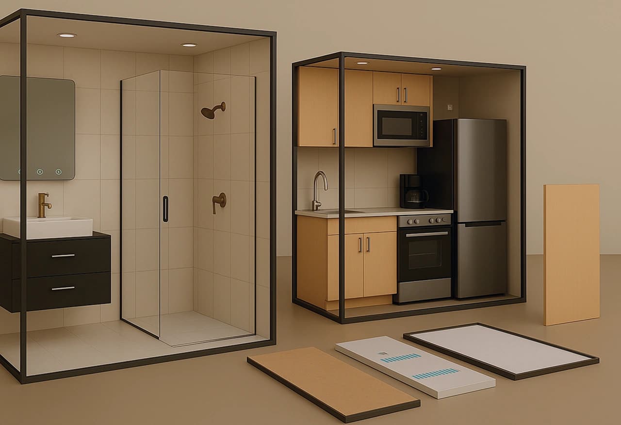 Factory-built kitchen units, typically with a galley layout. Delivered with cabinetry, counters, and service connections integrated.